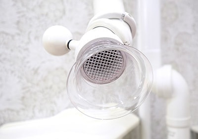 歯を削ったり、歯石を取り除く際、目に見えない飛沫や粉じんが排出されます。それらが広がらないために、口腔外バキュームを導入しております。優れた集塵効果で、診療時に発生する粉じんや飛沫をキャッチし吸引。診療室をクリーンで快適な空間に保ちます。